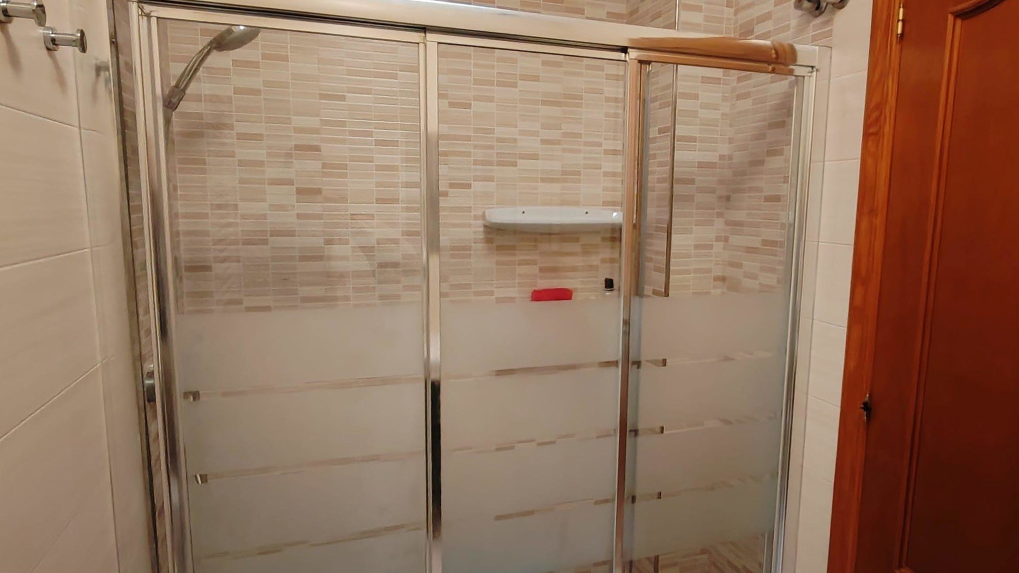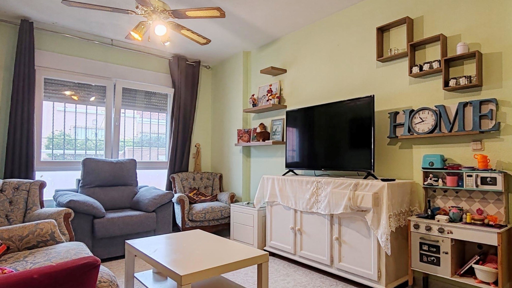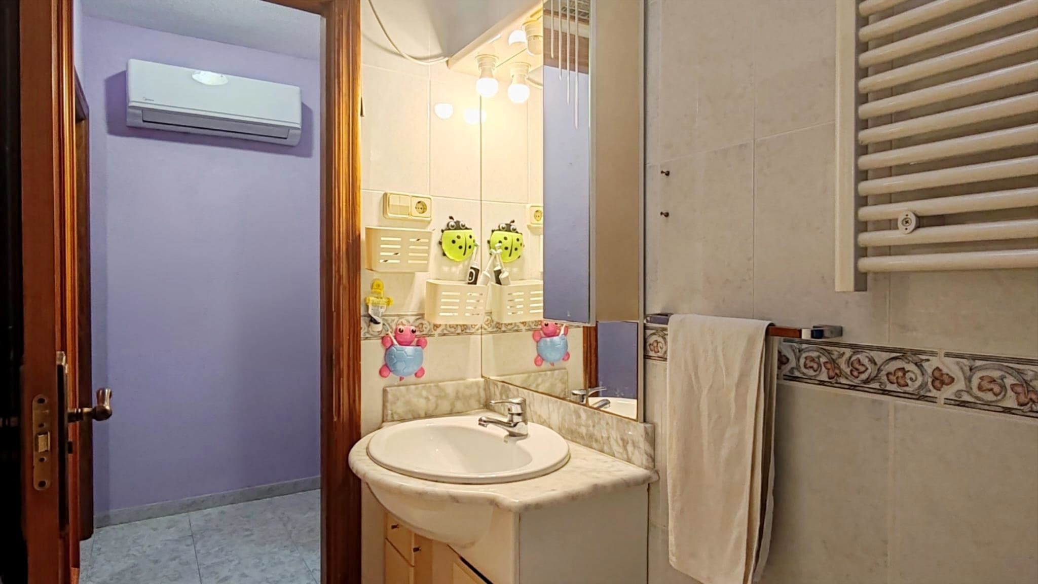 La vivienda se organiza de forma inteligente en dos áreas diferenciadas. En el ala derecha encontramos tres dormitorios: uno principal con cama de 135 y canapé, un dormitorio juvenil con literas y un tercer dormitorio de invitados con cama de matrimonio; todos ellos equipados con armarios empotrados y ventiladores de techo. Esta zona dispone de un baño de gran tamaño con plato de ducha, toallero eléctrico y una claraboya que aporta luz natural cenital, además de un aire acondicionado independiente en el pasillo que da servicio a estas tres estancias.