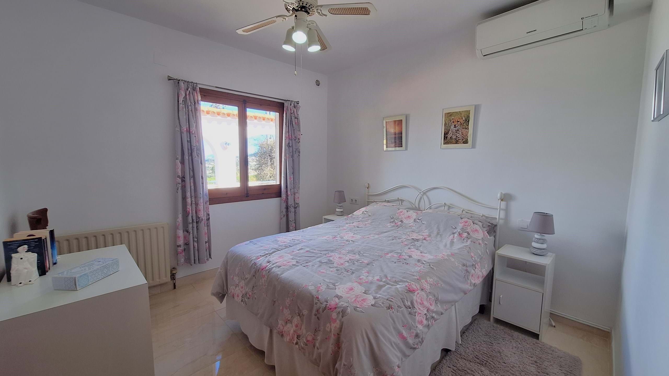 A hallway leads to the four good-sized bedrooms, three benefiting from built-in wardrobes, along with two separate family bathrooms. The master bedroom enjoys the added luxury of double doors opening directly onto the pool terrace, seamlessly blending indoor and outdoor living.